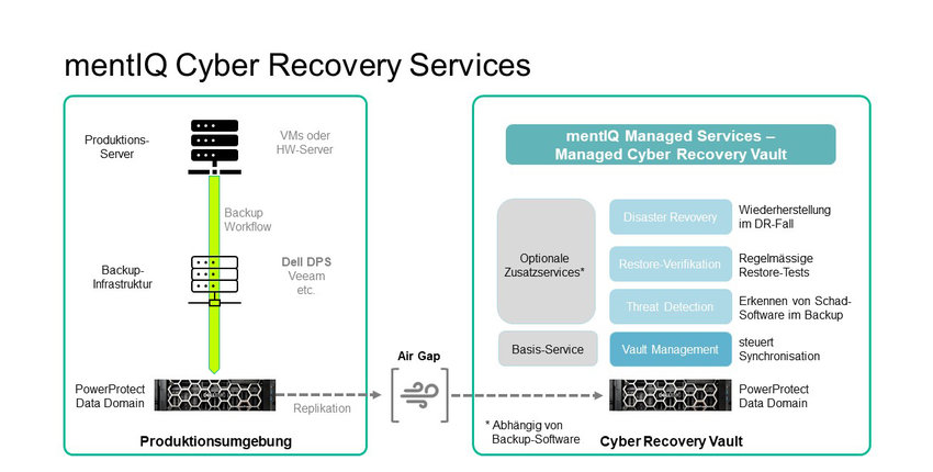 - mentIQ bietet Cyber Recovery as a Service (CRaaS) an – wir hosten und betreiben für Sie die gesamte Cyber-Recovery-Lösung. Sie haben dabei die Wahl zwischen verschiedenen Abrechnungsmodellen – bis hin zu einem „Pay-as-you-use“-Modell.